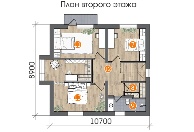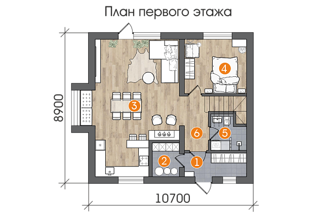 Средних размеров двухэтажный дом для большой семьи. Первый этаж отлично подходит для приема гостей, присутствует даже гостевая спальня Второй этаж приватный, для отдыха членов семьи.