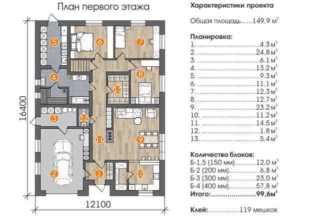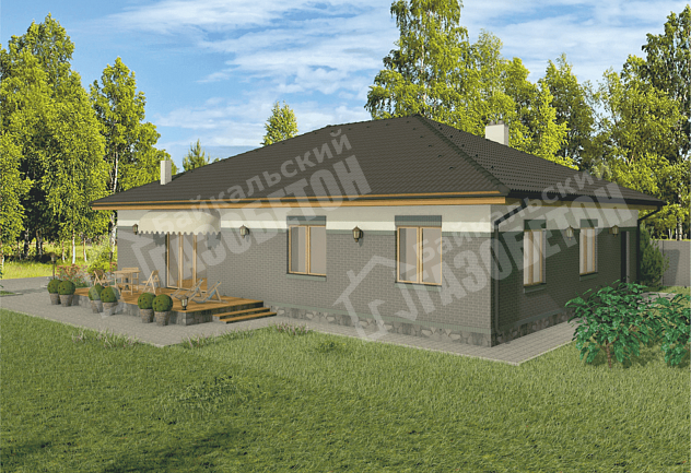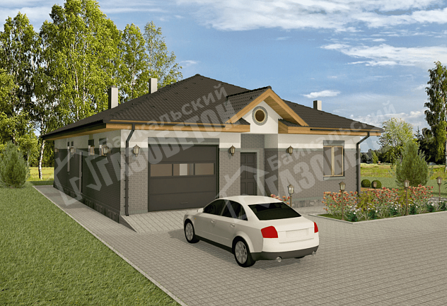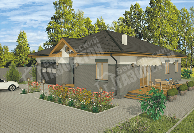 Одноэтажный дом, в котором учтены все пожелания большой семьи. Большая гостиная совмещенная с кухней, три спальни, гараж.